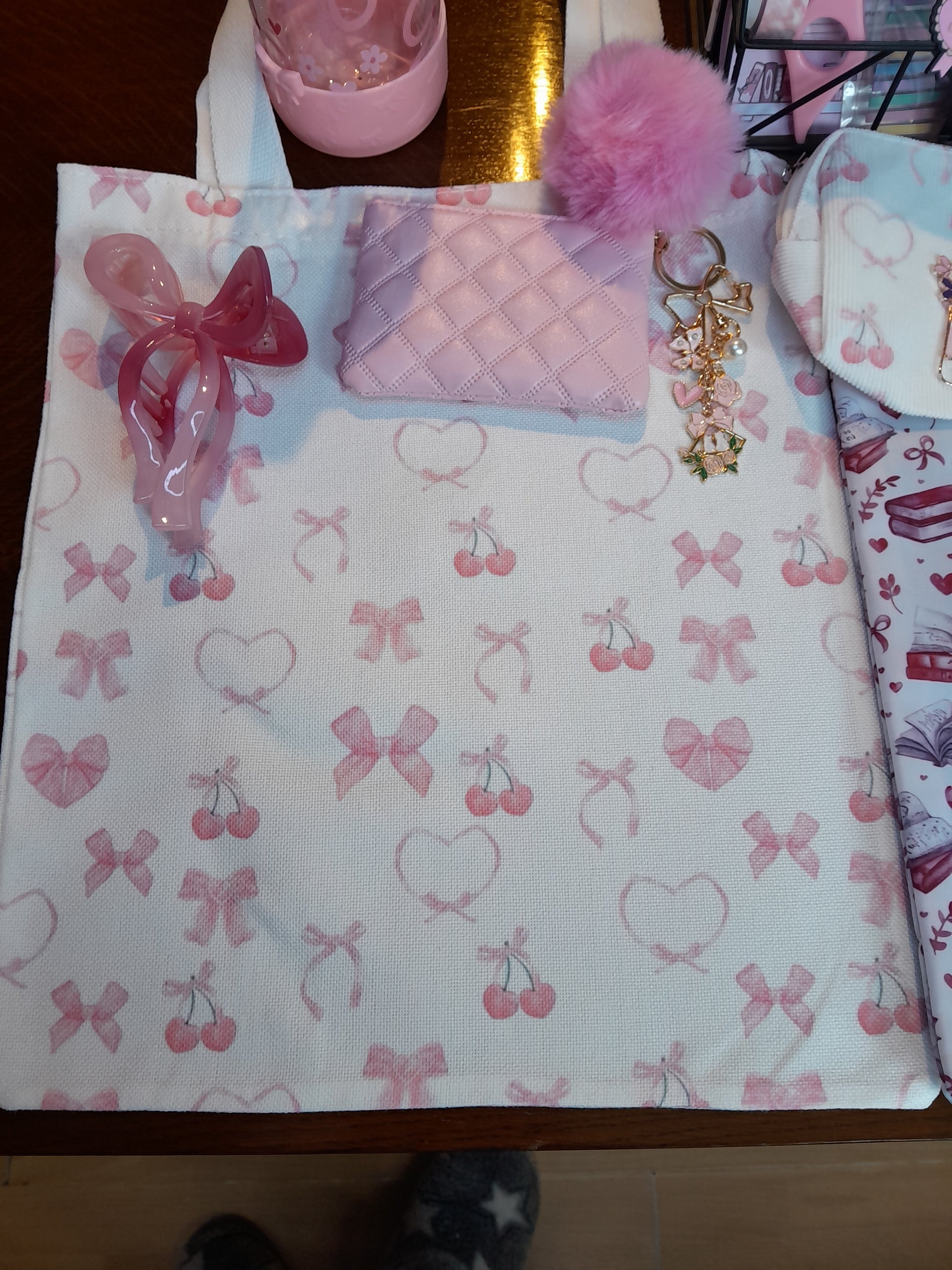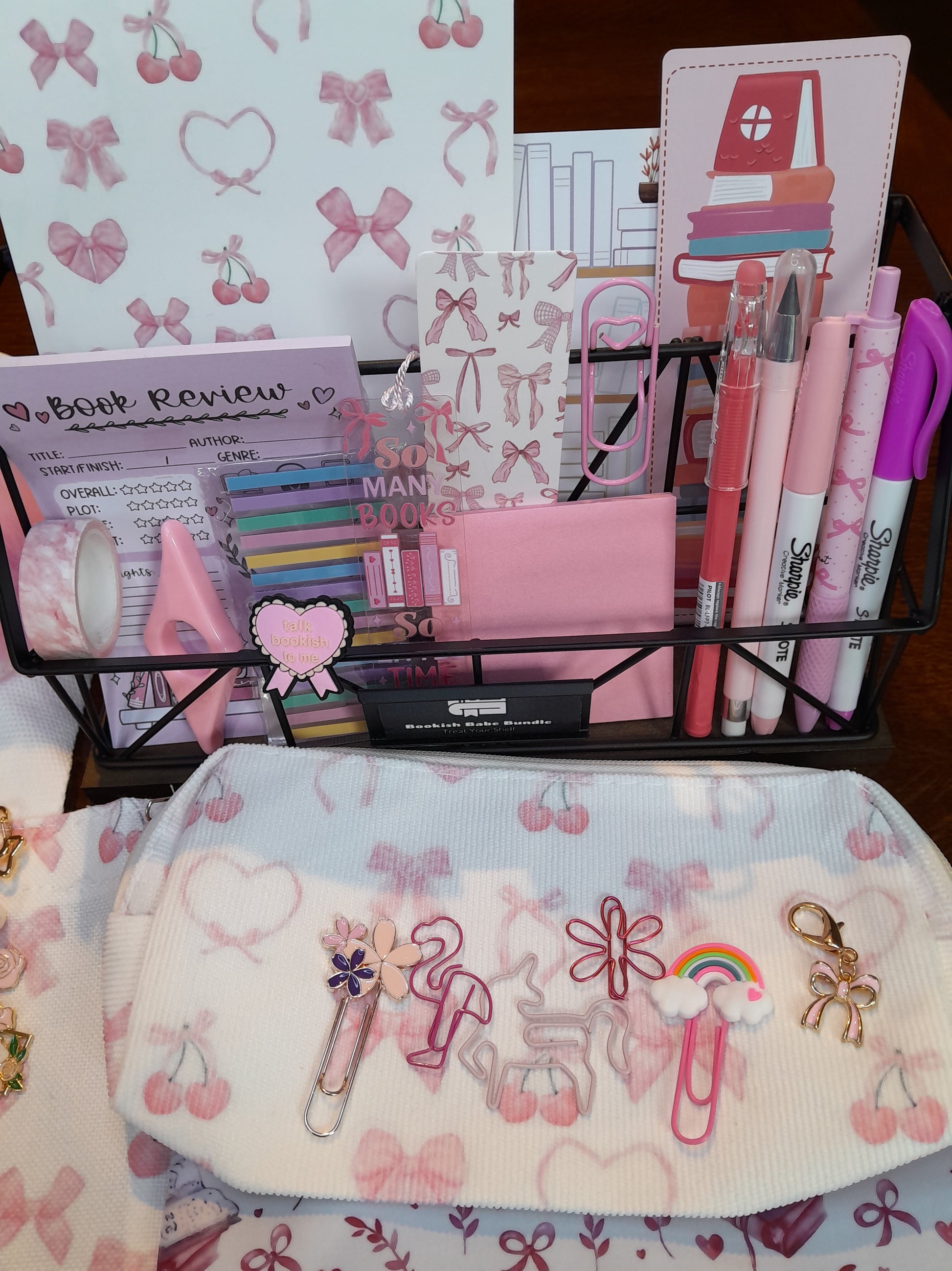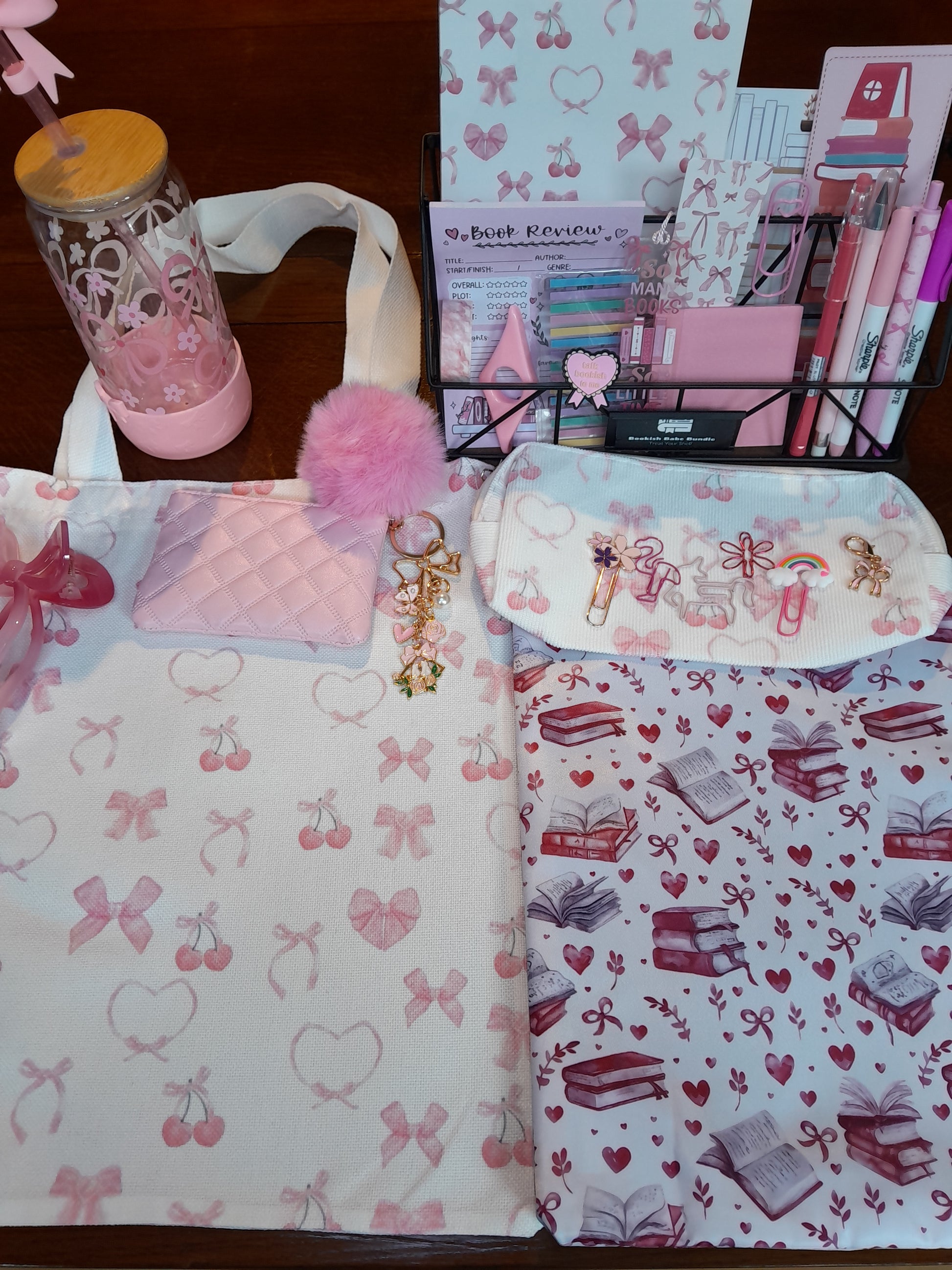 Pink bows bundle, I includes a tote bag and matching pencil case and notebook with a book sleeve and a gorgeous glass cup. Stationery is also included and a cute bag charm and hair clip.