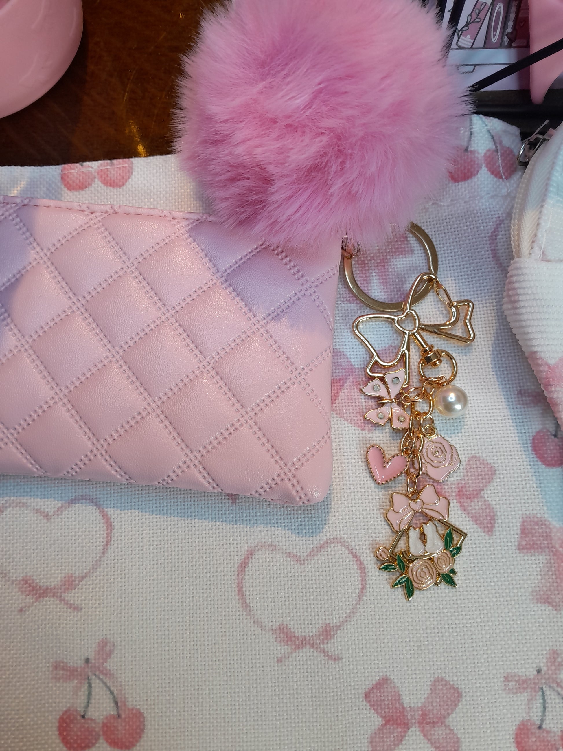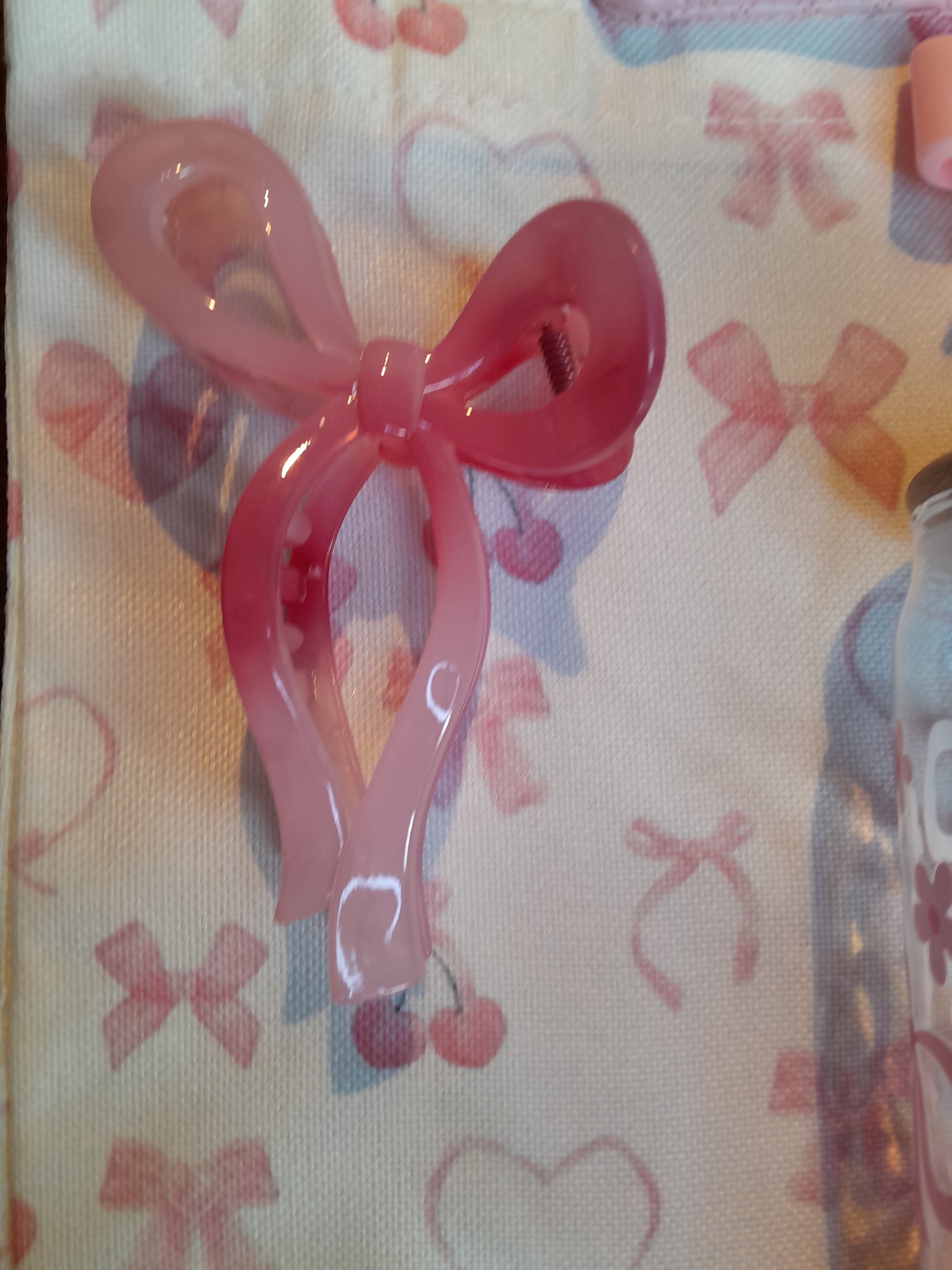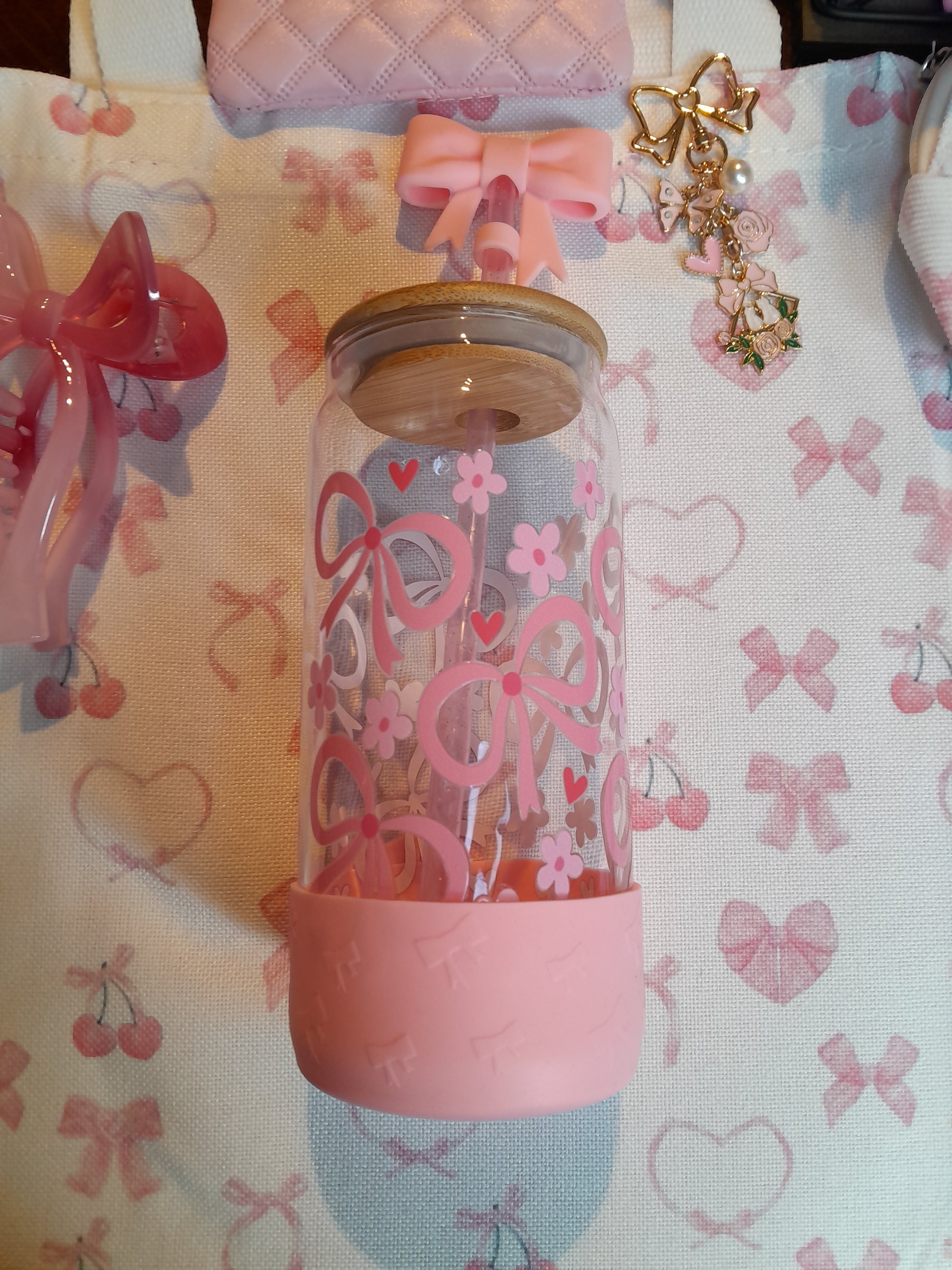 Pink bows bundle, I includes a tote bag and matching pencil case and notebook with a book sleeve and a gorgeous glass cup. Stationery is also included and a cute bag charm and hair clip.