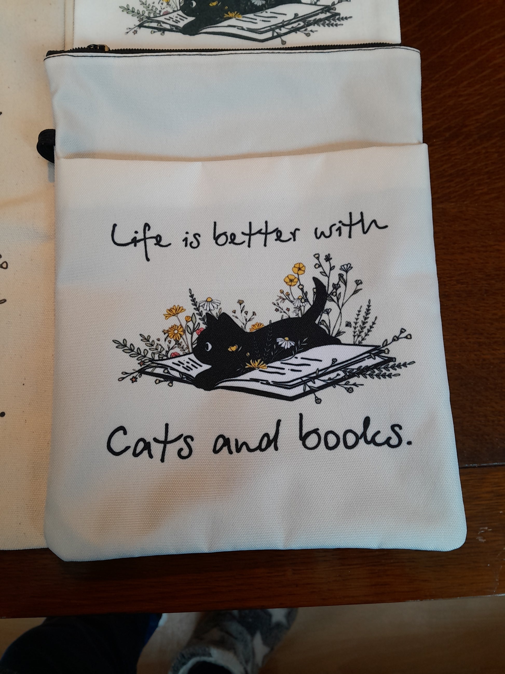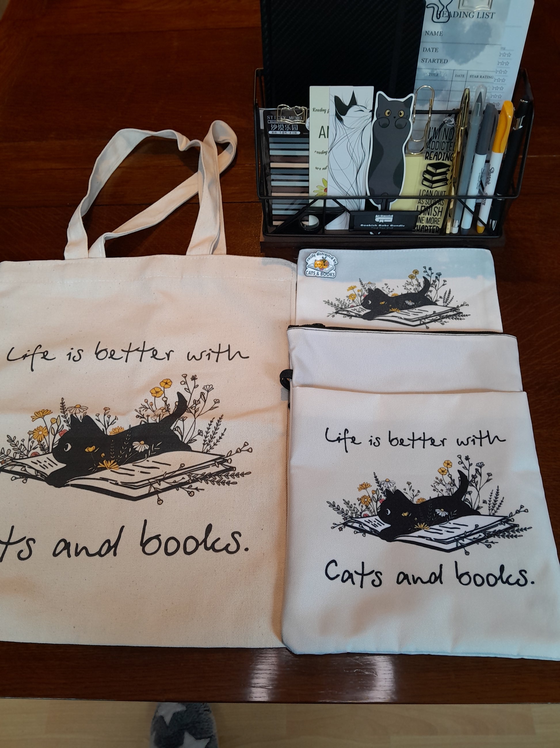 Cute cats and books themed bundle, tote bag and pencil case and a lovely book sleeve. Lots of lovely stationery included.