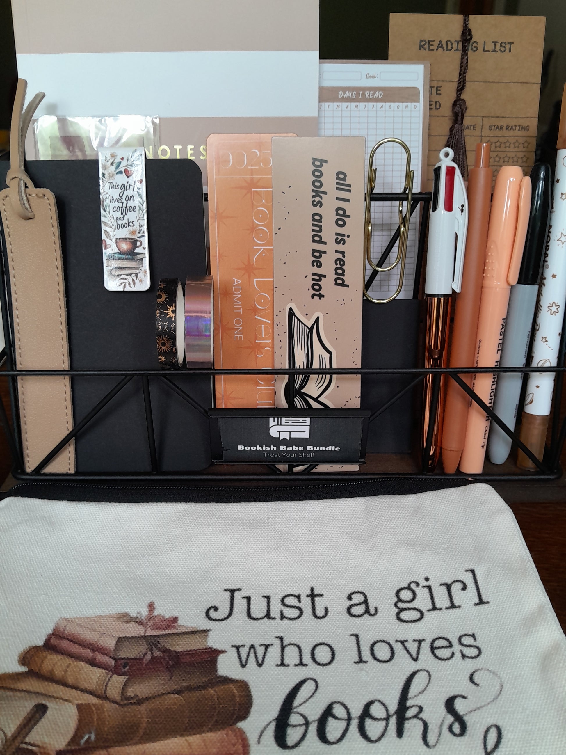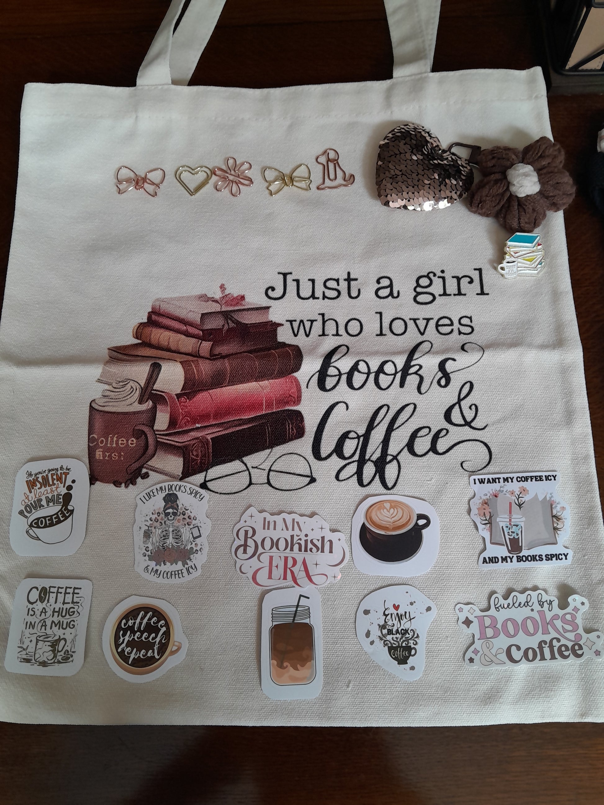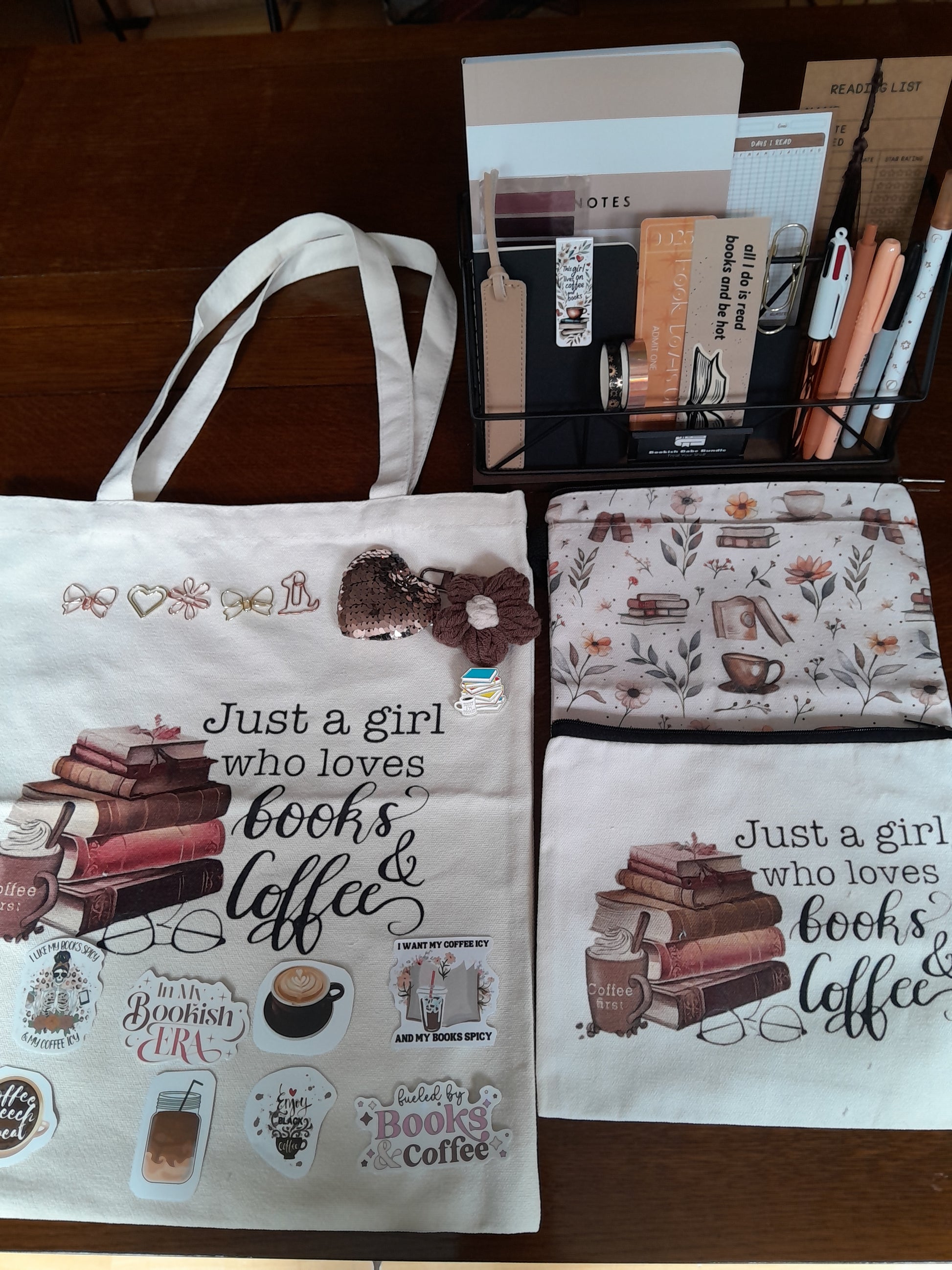 Coffee and books bundle includes a tote bag, book sleeve and pencil case. Lots of lovely stationery included.