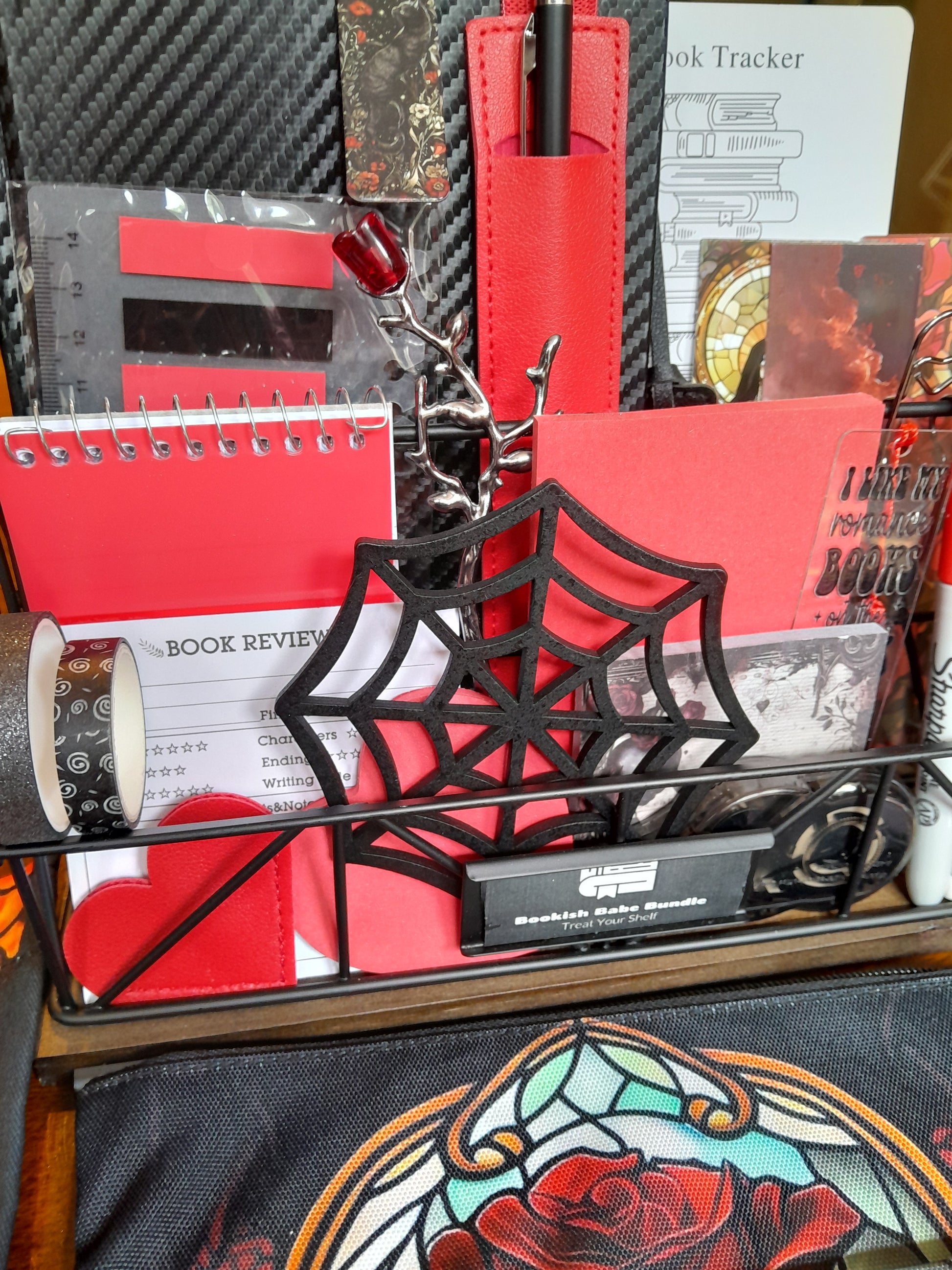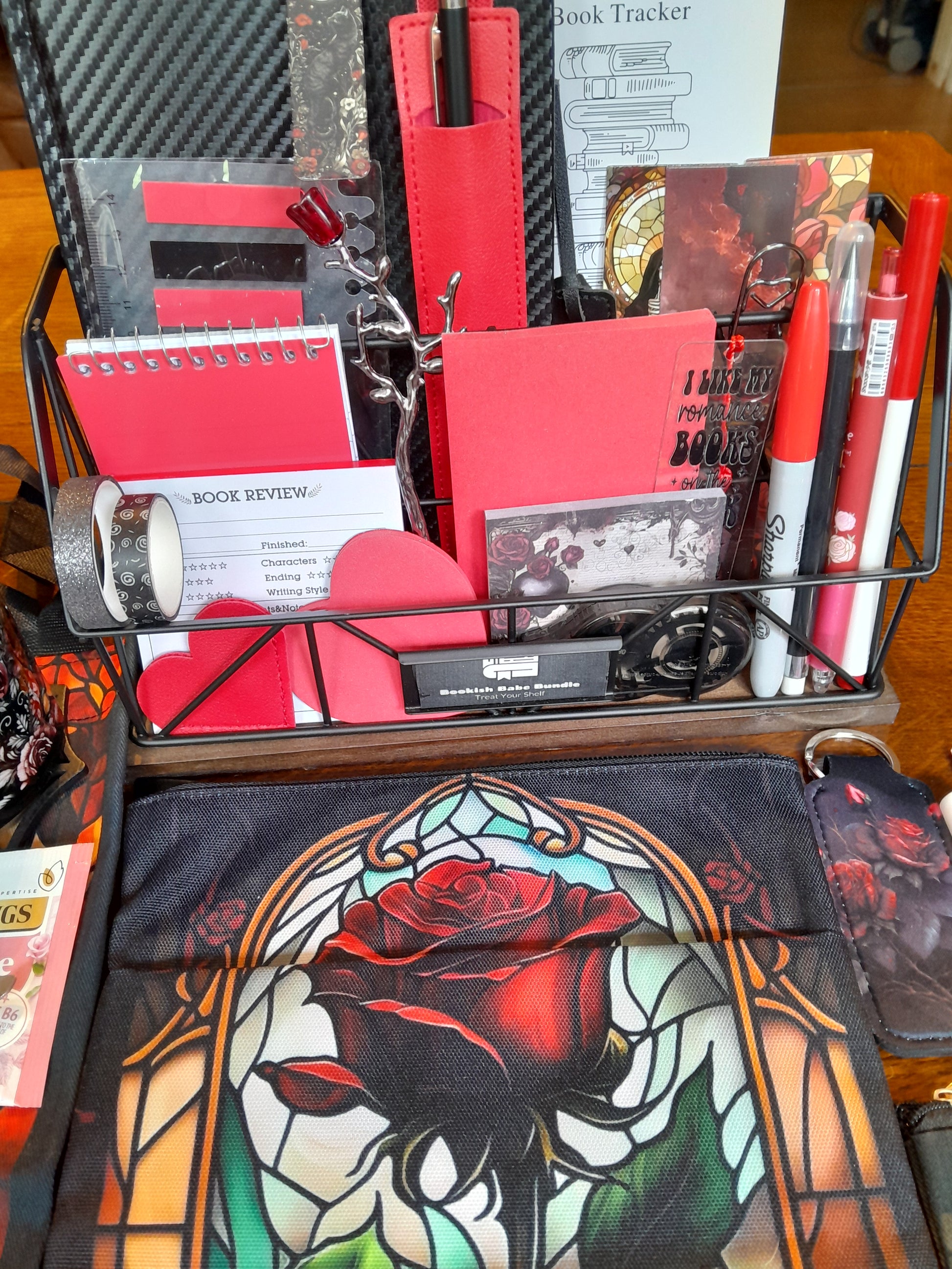 Stunning dark romance rose themed bundle. Contains a book sleeve, tote bag and pencil case, gorgeous mug and lots of stationery.