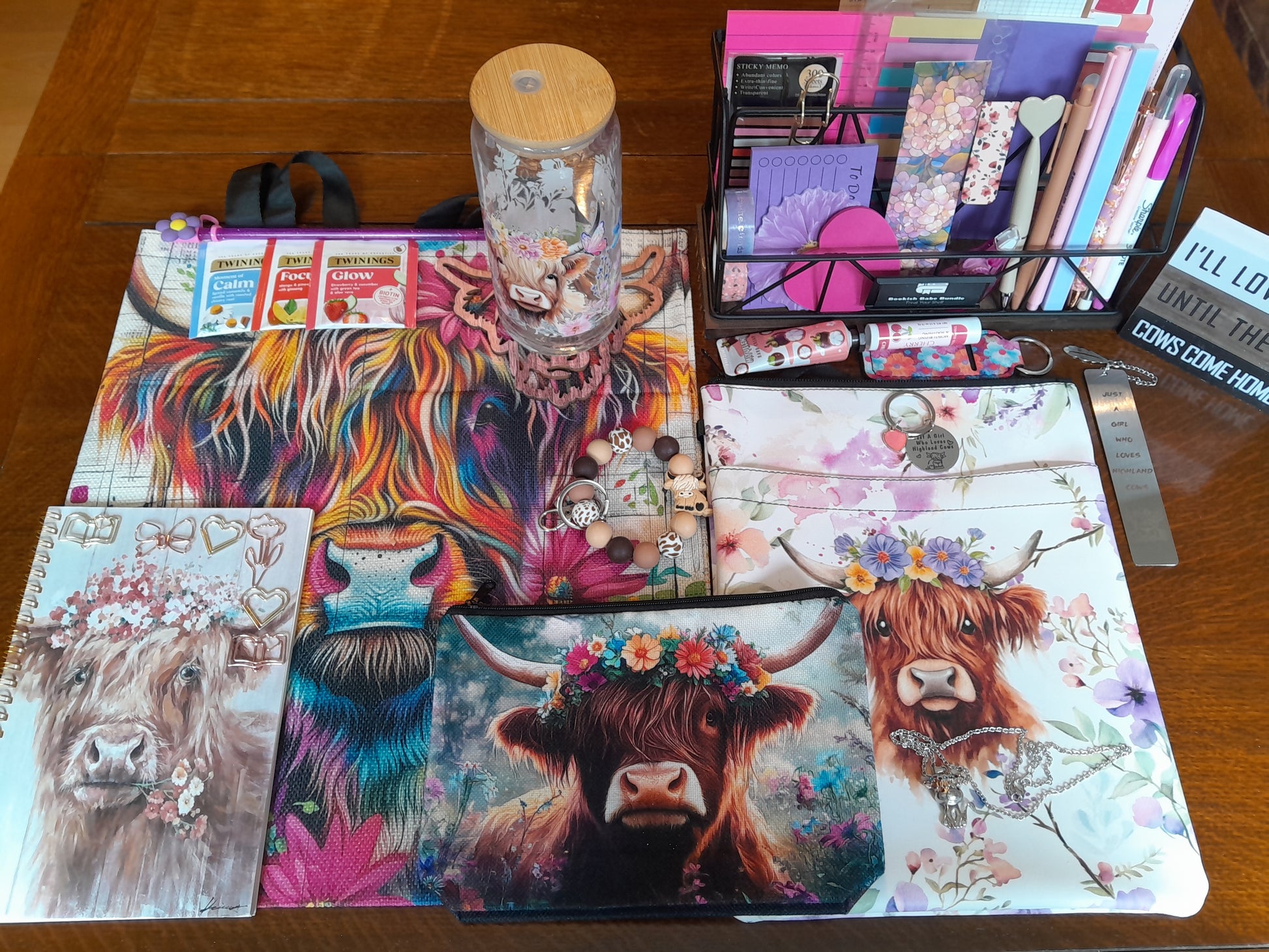 Highland Cow bundle. A gorgeous collection for the Highland Coo fan, containing a book sleeve, tote bag, pencil case, glass cup, notebook and lots of stationery and Cow themed items.