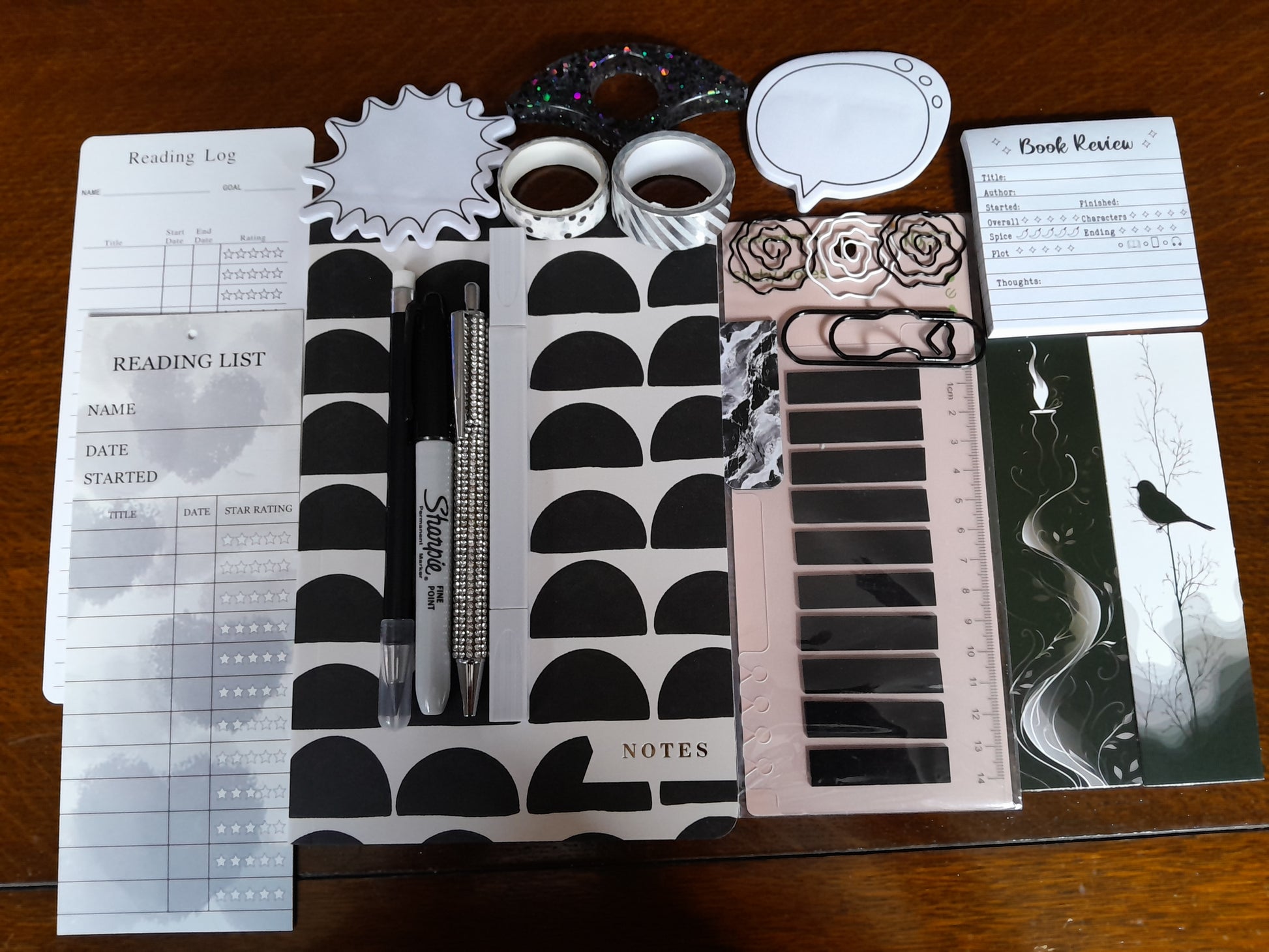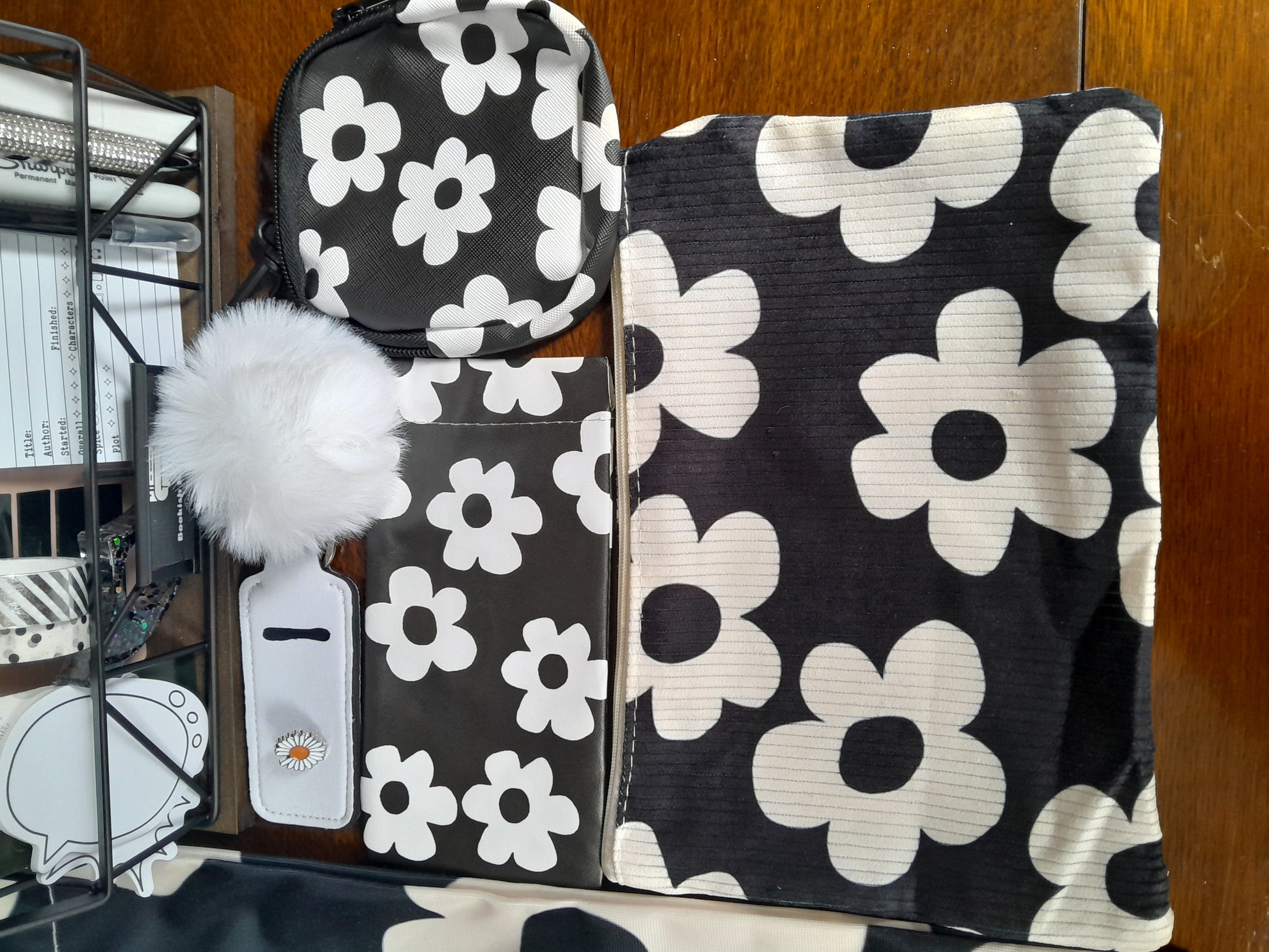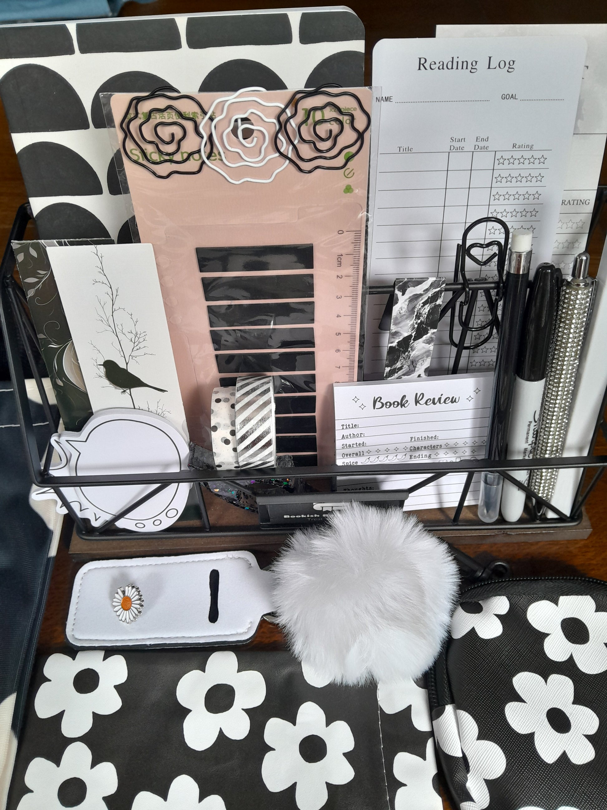 Lovely neutral bundle tote bag, storage pouch, glasses pouch and mini clip on bag. Notebook and lots of stationery.