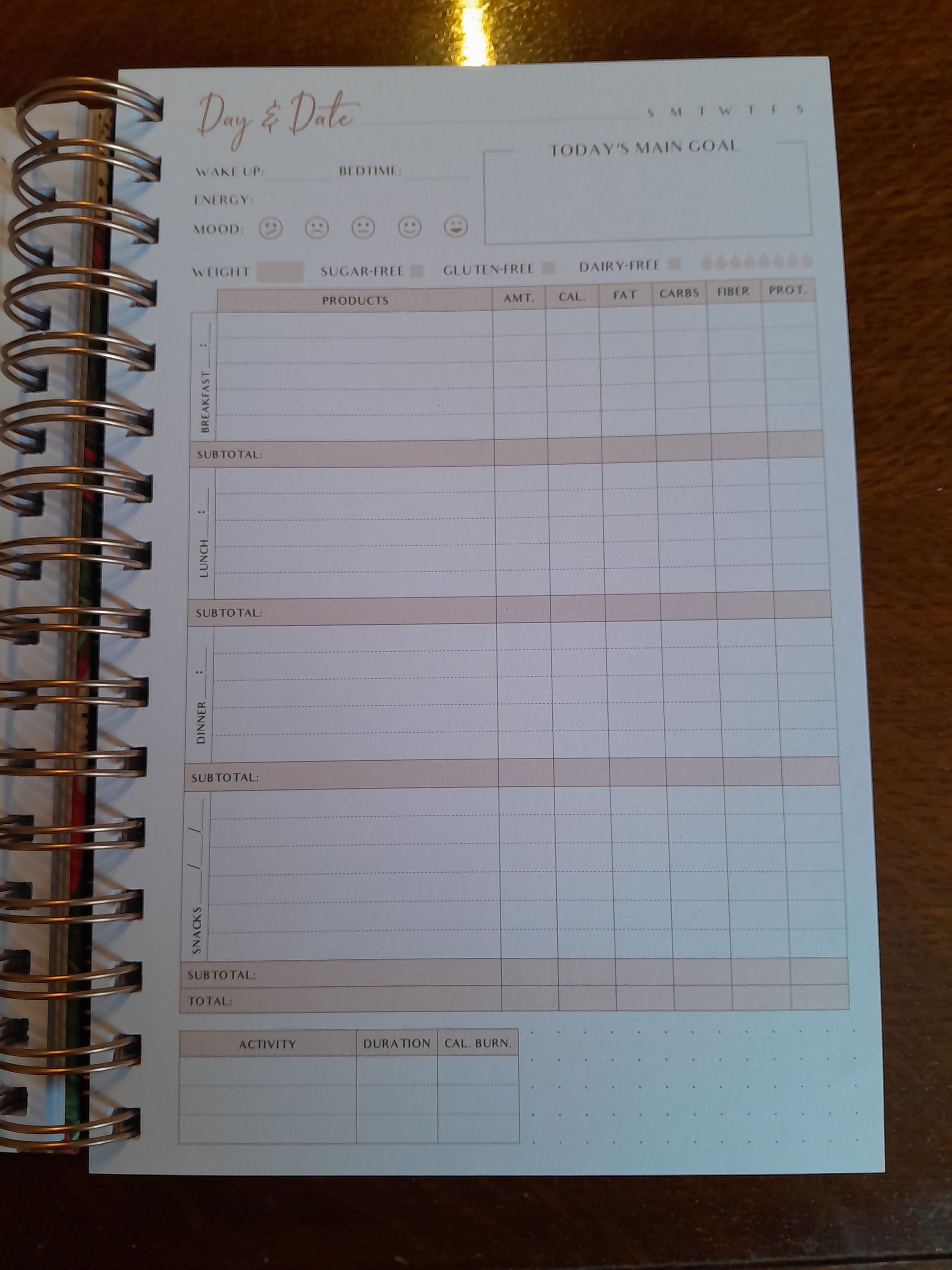 Food journal which allows you to easily track progress and set goals. Beautiful hard cover A5 4 month undated planner.