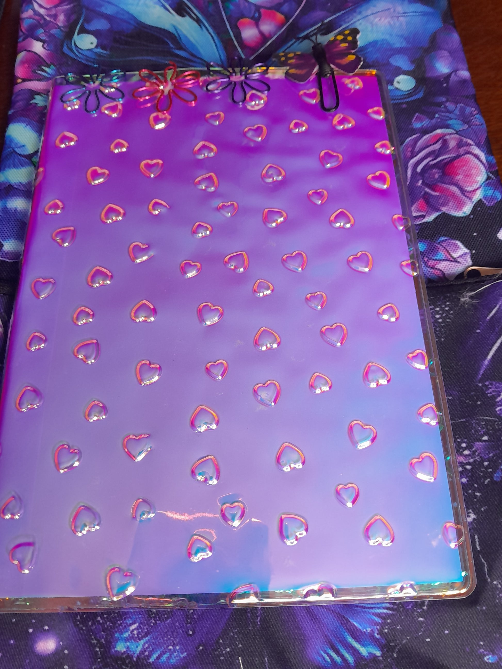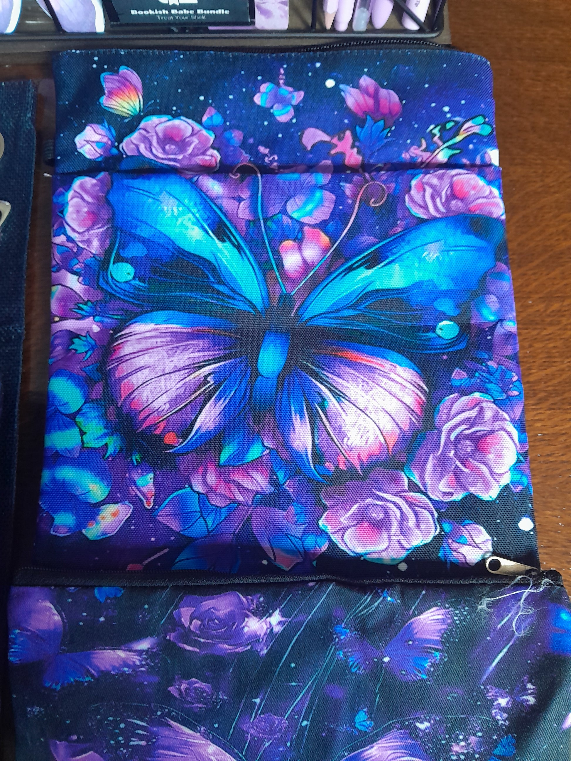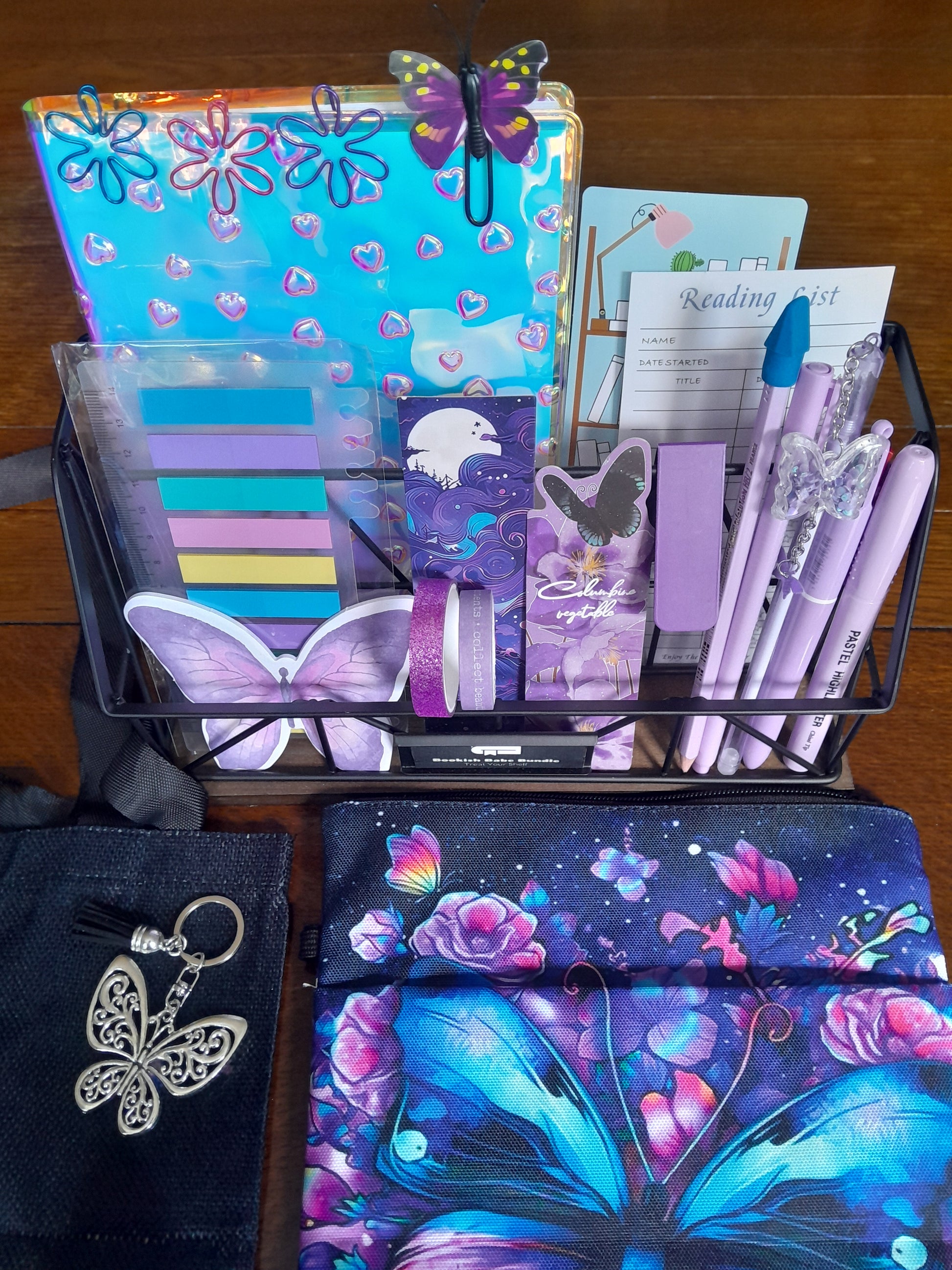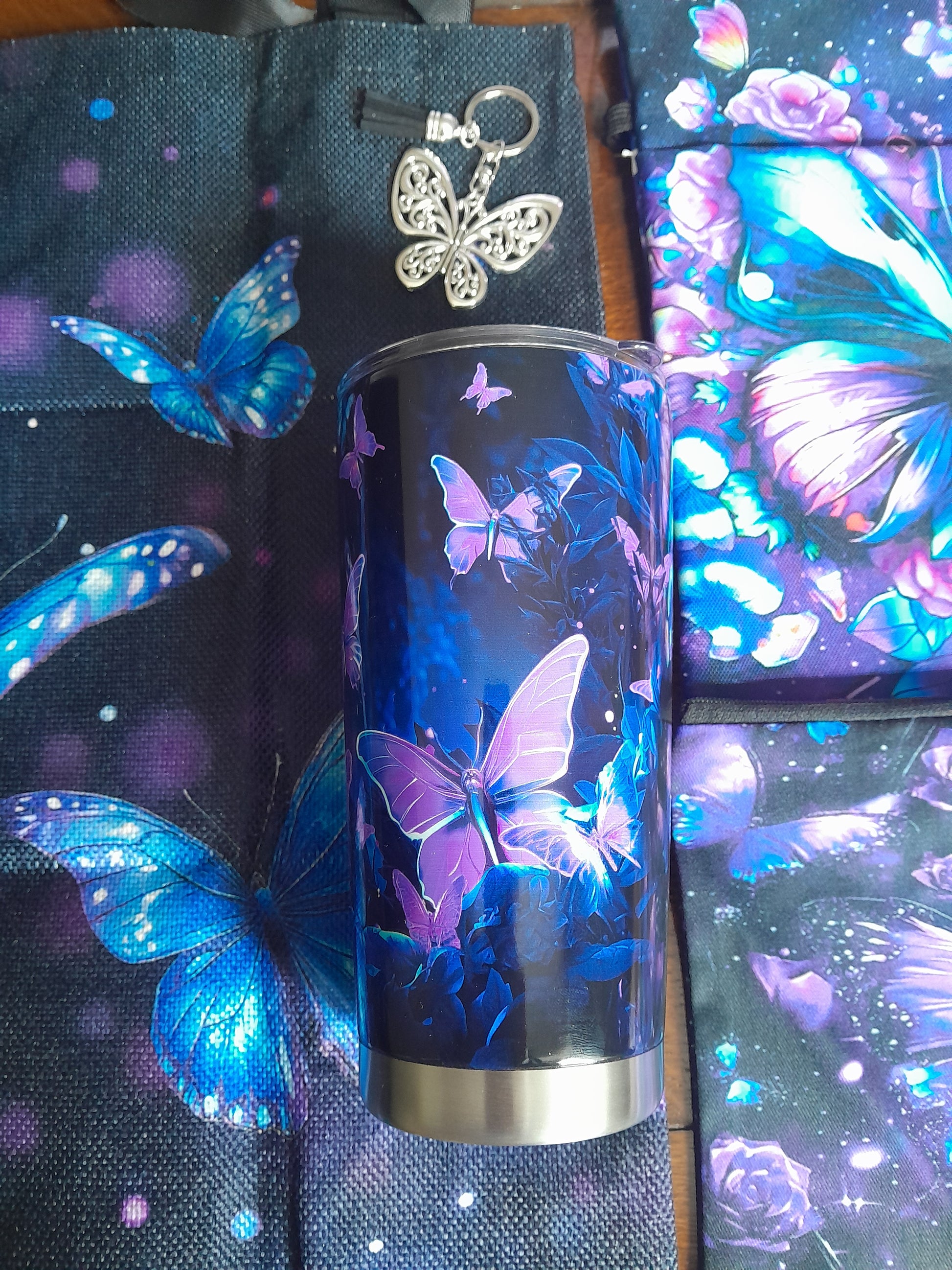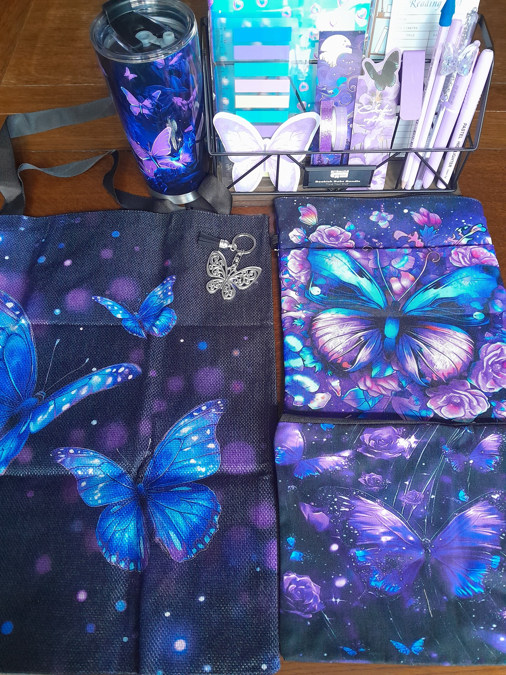 Stunning butterfly bundle includes a tote bag, book sleeve and storage pouch. Large insulated cup and holographic notebook with lots of stationery.
