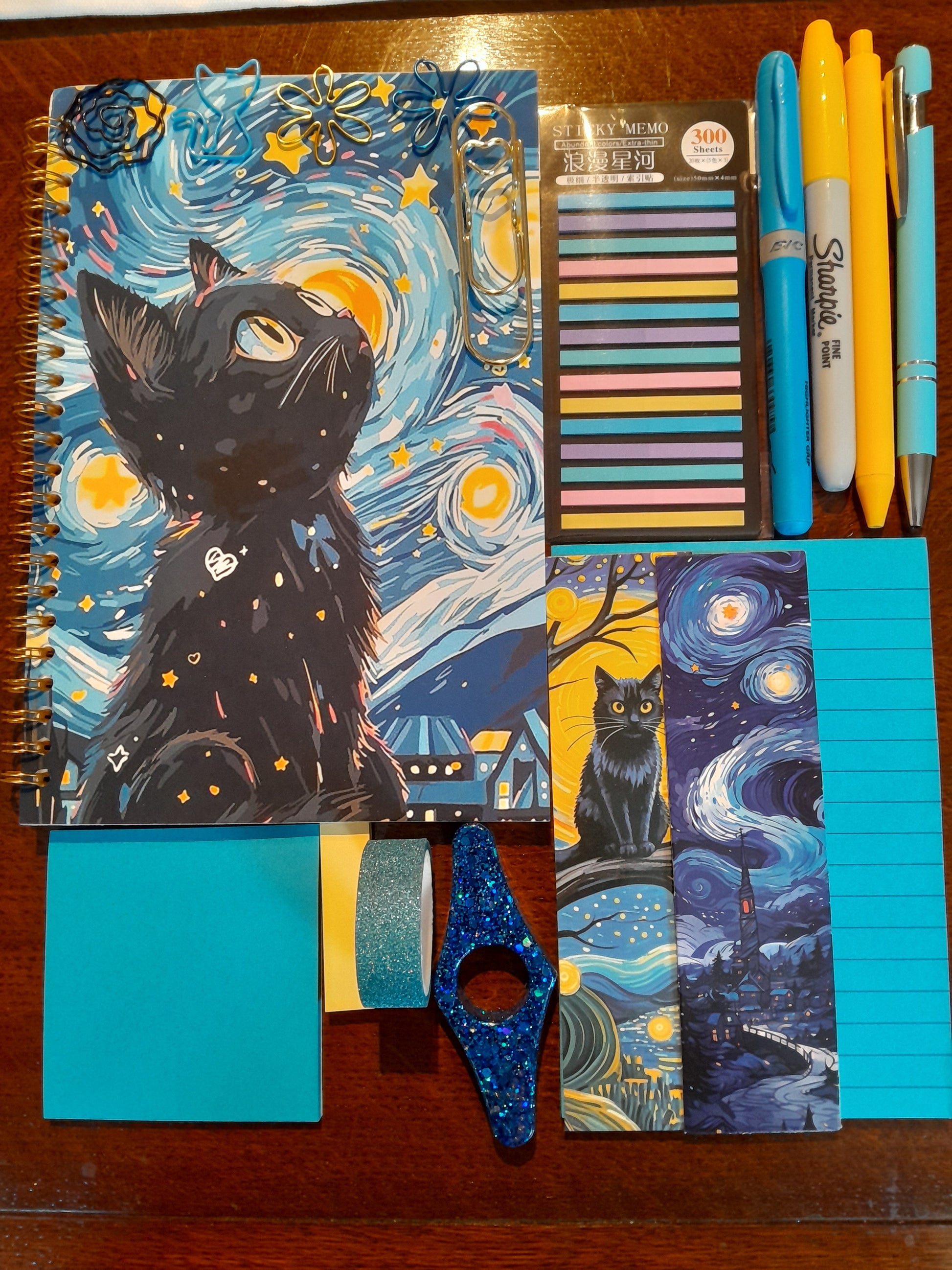 Lovely cat themed bundle includes a tote bag, book sleeve, storage pouch and notebook also lots of stationery.