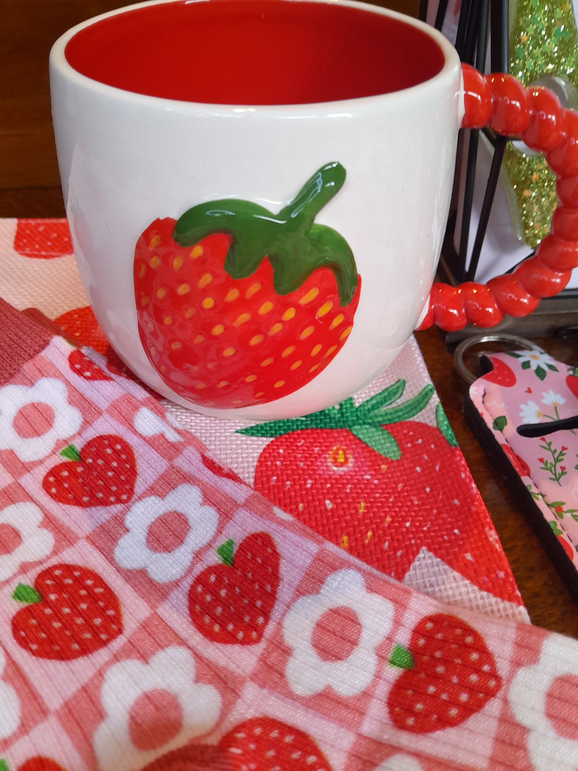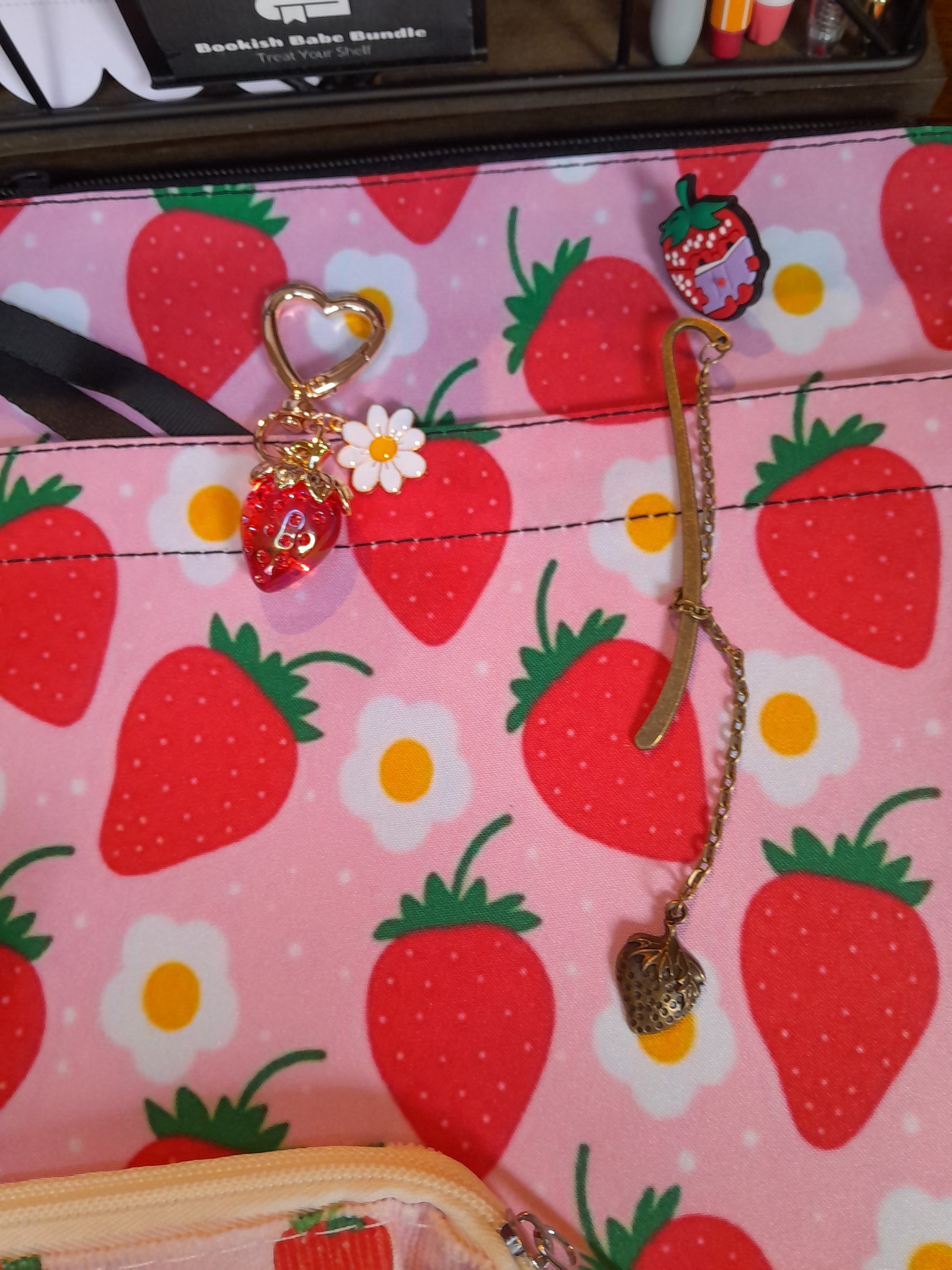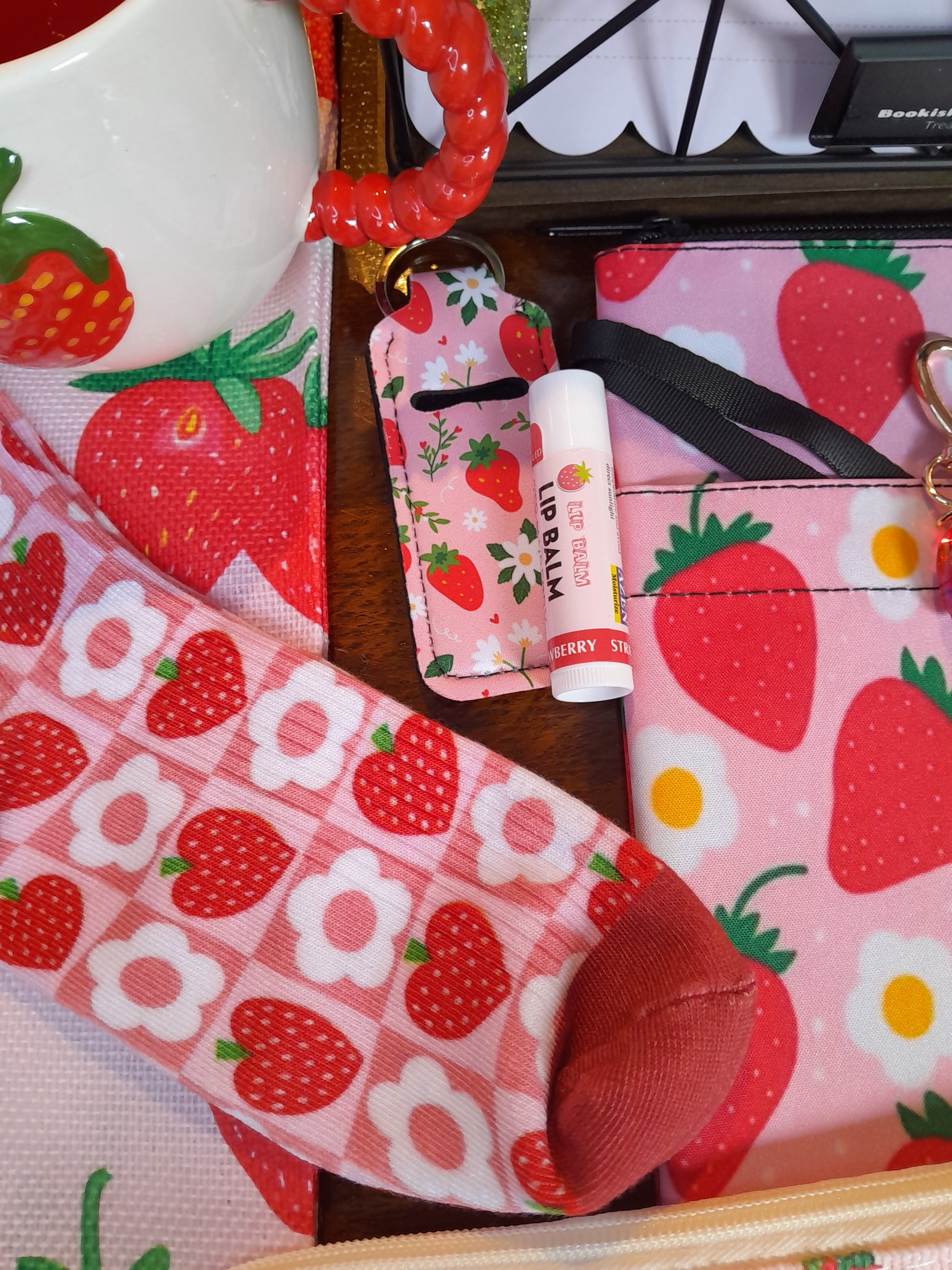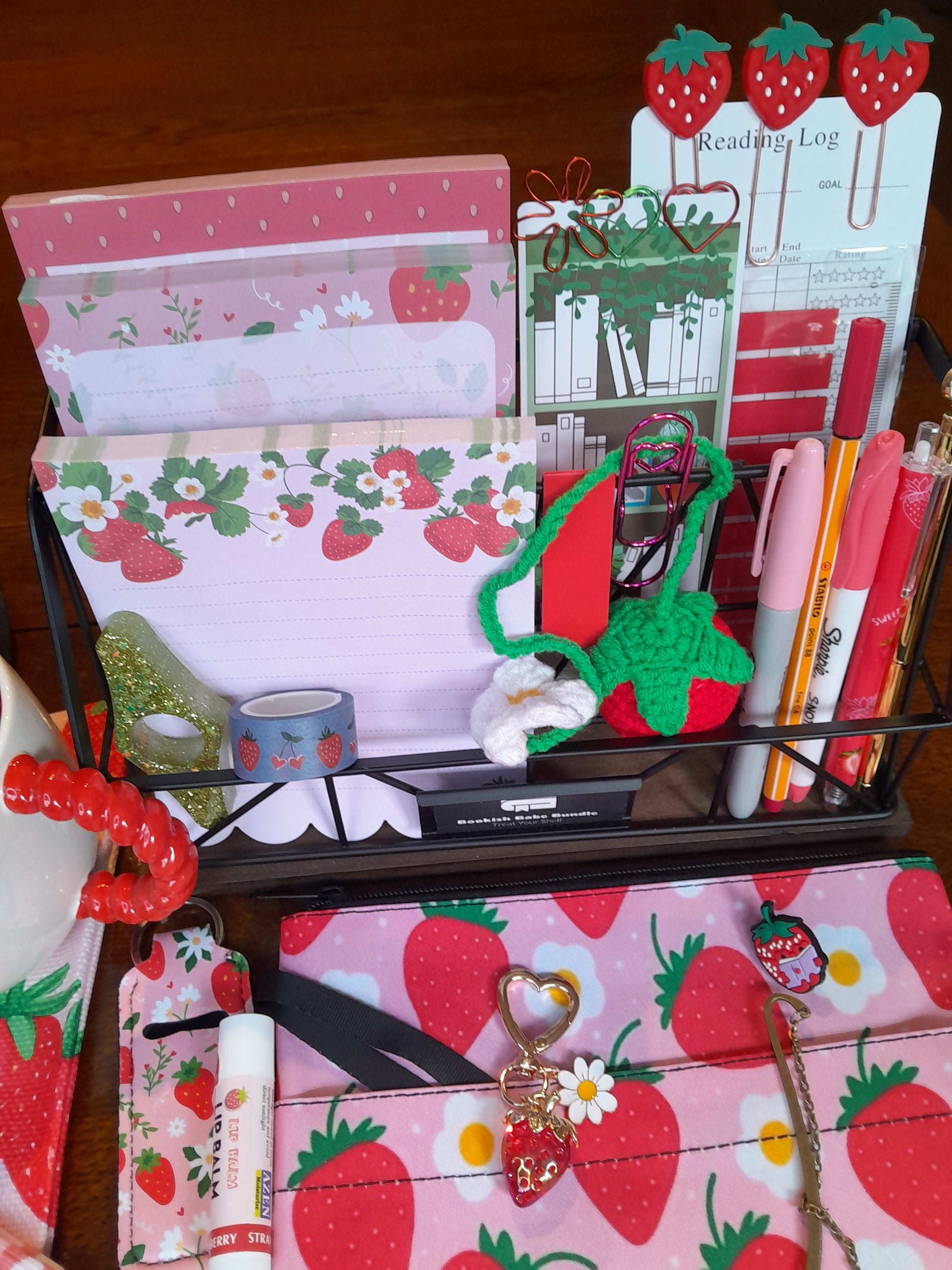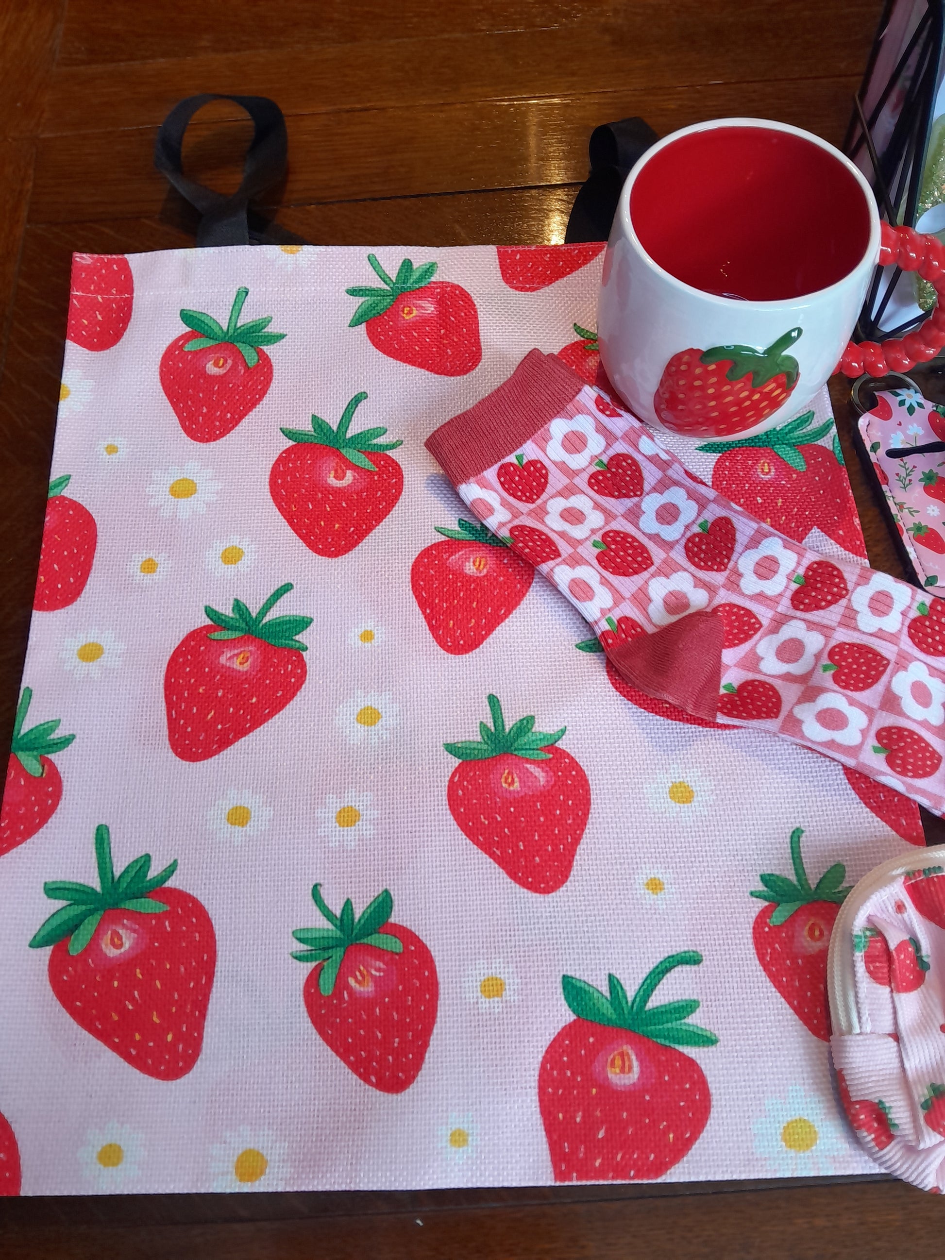 Strawberry themed bundle including a tote bag, book sleeve, and pencil case also a beautiful notebook stack and stationery. Little extras included too like socks, bag charm and a knit book mark.